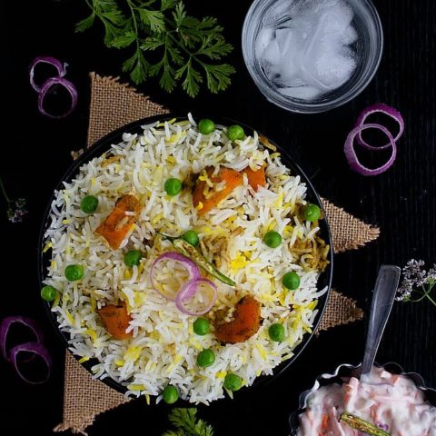 A Classic Indian veg biryani is a perfect dish for any occasion. Long grain basmati rice and assorted vegetables in a spicy masala are cooked in alternate layers under dum to give you a final dish that is a treat to your all of your senses. Whole spices, fragrant rice, nutritious veggies and the aromatic saffron blend together perfectly in this vegetable biryani recipe and that is the magic of a good dum biryani.